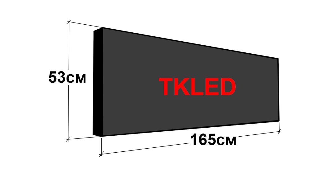 Размер самой конструкции бегущей строки в профиле составляет 165 см на 53 см. Размер рабочего поля для программирования составляет 160 см на 48 см.