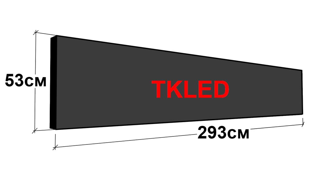 Размер самой конструкции бегущей строки в профиле составляет 293 см на 53 см. Размер рабочего поля для программирования составляет 288 см на 48 см.
