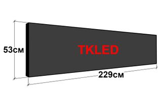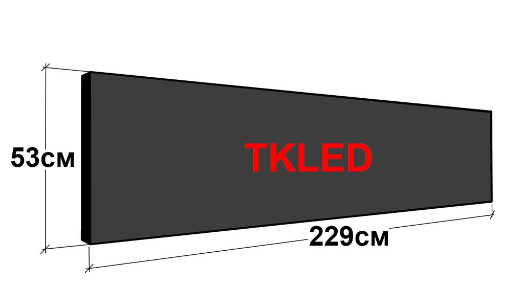 Размер самой конструкции бегущей строки в профиле составляет 229 см на 53 см. Размер рабочего поля для программирования составляет 224 см на 48 см.